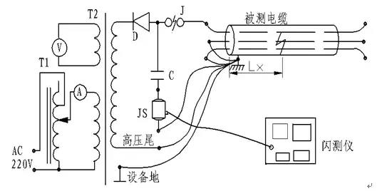 高壓閃絡測試法主要適用于測試電纜的高阻泄漏性故障及高阻閃絡性故障。對于各種低阻故障,在低壓脈沖測試完畢后,也可用高壓閃絡法做驗證測試。高壓閃絡法又分為沖擊高壓閃絡法(沖閃法)和直流高壓閃絡法(直閃法)。下面分別介紹: